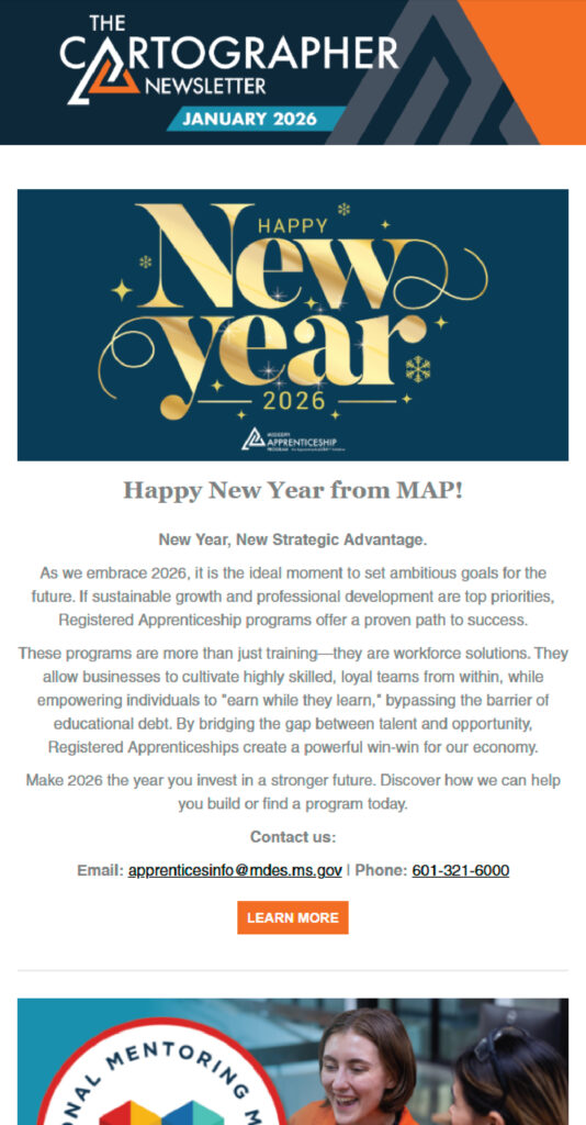 The Mississippi Apprenticeship Program (MAP) offers a range of services that help businesses develop, recruit, and retain a highly skilled workforce through highly customizable and highly effective Registered Apprenticeship (RA) programs. MAP can help your company start or grow a RA program.